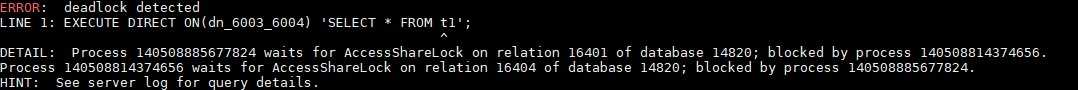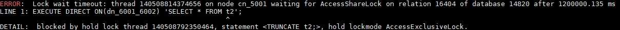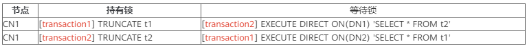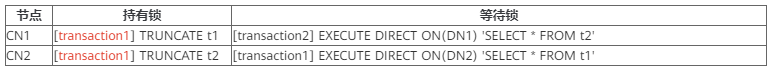 -- 事務 transaction1 -- 所在節(jié)點:CN1 BEGIN; TRUNCATE t1; EXECUTE DIRECT ON(DN1) 'SELECT * FROM t2'; COMMIT; -- 事務 transaction2 -- 所在節(jié)點:CN2 BEGIN; TRUNCATE t2; EXECUTE DIRECT ON(DN2) 'SELECT * FROM t1'; COMMIT;