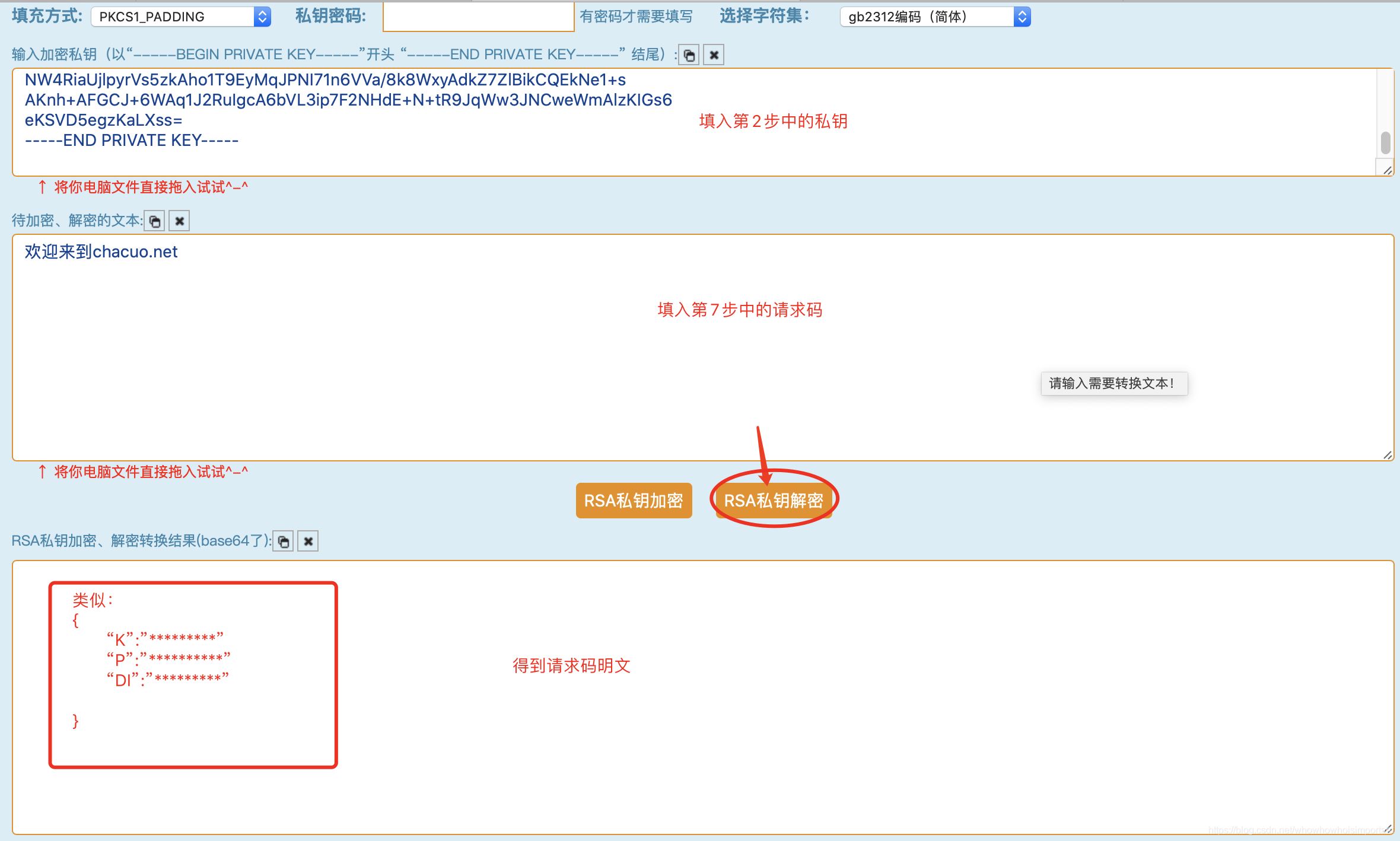 8、登錄在線RSA私鑰加密解密這個網(wǎng)址 http://tool.chacuo.net/cryptrsaprikey , 填上第2步的私鑰,填上請求碼(第7步中復(fù)制的),點擊RSA私鑰解密。具體操作可以參考下圖: