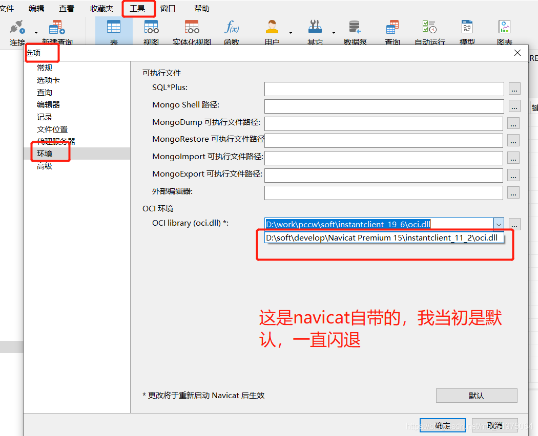 2、通過(guò)工具—>選項(xiàng)—>環(huán)境 進(jìn)入OCI環(huán)境配置,修改OCIlibrary為下載的instantclient下的oci.dll配置文件