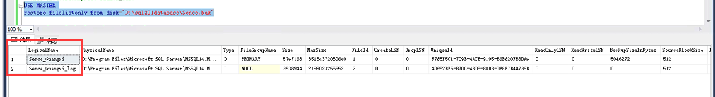 USE MASTER restore filelistonly from disk='D:\sql201database\Sence.bak'--根據(jù)自己的需求要變更路徑