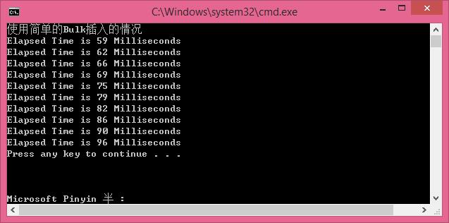 Console.WriteLine("使用簡單的Bulk插入的情況");