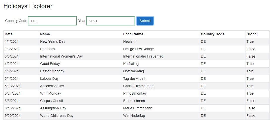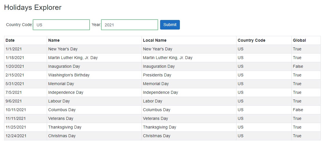 運(yùn)行應(yīng)用程序并在文本框中提供任意國(guó)家代碼和年份。點(diǎn)擊 Submit 按鈕就會(huì)在后臺(tái)調(diào)用我們的 GetHolidays 方法,然后您應(yīng)該能看到如下所示的公共假期列表。