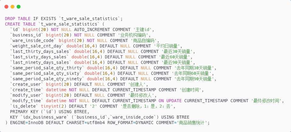 DROP TABLE IF EXISTS `t_ware_sale_statistics`; CREATE TABLE `t_ware_sale_statistics` ( `id` bigint(20) NOT NULL AUTO_INCREMENT COMMENT '主鍵id', `business_id` bigint(20) NOT NULL COMMENT '業(yè)務(wù)機(jī)構(gòu)編碼', `ware_inside_code` bigint(20) NOT NULL COMMENT '商品自編碼', `weight_sale_cnt_day` double(16,4) DEFAULT NULL COMMENT '平均日銷(xiāo)量', `last_thirty_days_sales` double(16,4) DEFAULT NULL COMMENT '最近30天銷(xiāo)量', `last_sixty_days_sales` double(16,4) DEFAULT NULL COMMENT '最近60天銷(xiāo)量', `last_ninety_days_sales` double(16,4) DEFAULT NULL COMMENT '最近90天銷(xiāo)量', `same_period_sale_qty_thirty` double(16,4) DEFAULT NULL COMMENT '去年同期30天銷(xiāo)量', `same_period_sale_qty_sixty` double(16,4) DEFAULT NULL COMMENT '去年同期60天銷(xiāo)量', `same_period_sale_qty_ninety` double(16,4) DEFAULT NULL COMMENT '去年同期90天銷(xiāo)量', `create_user` bigint(20) DEFAULT NULL COMMENT '創(chuàng)建人', `create_time` datetime NOT NULL DEFAULT CURRENT_TIMESTAMP COMMENT '創(chuàng)建時(shí)間', `modify_user` bigint(20) DEFAULT NULL COMMENT '最終修改人', `modify_time` datetime NOT NULL DEFAULT CURRENT_TIMESTAMP ON UPDATE CURRENT_TIMESTAMP COMMENT '最終修改時(shí)間', `is_delete` tinyint(2) DEFAULT '2' COMMENT '是否刪除,1:是,2:否', PRIMARY KEY (`id`) USING BTREE, KEY `idx_business_ware` (`business_id`,`ware_inside_code`) USING BTREE ) ENGINE=InnoDB DEFAULT CHARSET=utf8mb4 ROW_FORMAT=DYNAMIC COMMENT='商品銷(xiāo)售統(tǒng)計(jì)';