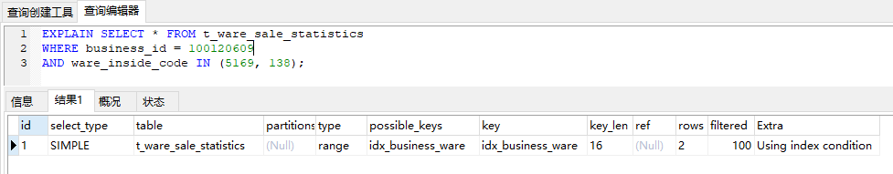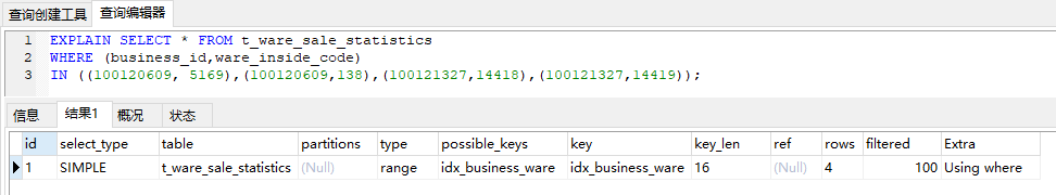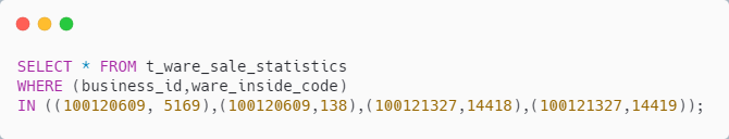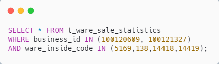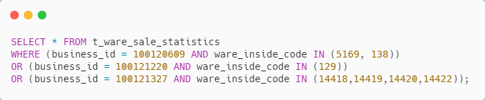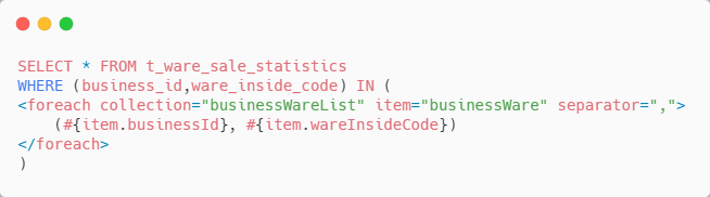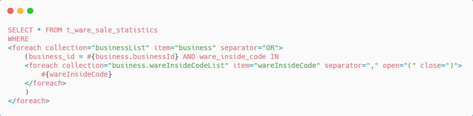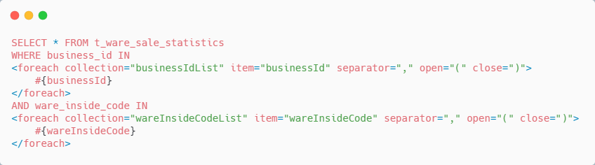 同樣是利用Mybatis的動(dòng)態(tài) SQL,將business_id列表拼在一起、ware_inside_code拼在一起,類(lèi)似如下