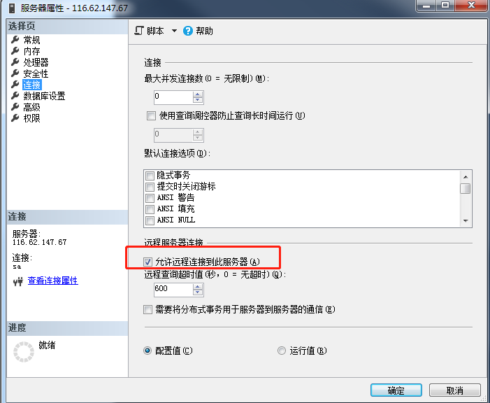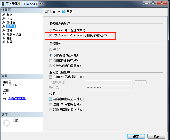 登錄成功之后,右鍵打開屬性,在安全性選項卡勾選sql server和windows身份認證模式,在連接選項卡勾選允許遠程連接到此服務(wù)器,如下圖: