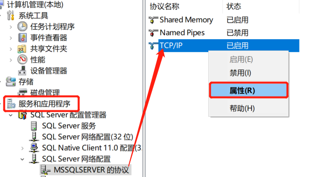 找到服務(wù)和應(yīng)用程序,然后配置sqlserver網(wǎng)絡(luò)協(xié)議,啟用TCP/IP,右擊屬性,如圖:
