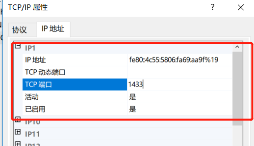 將IP1的TCP端口設(shè)置為1433,并啟用,如圖
