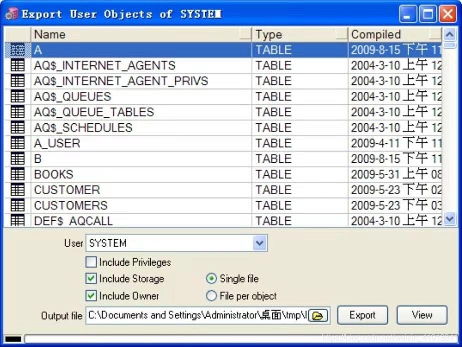 - (4)選擇列表中所有對象,并為【Output File】指定導(dǎo)出文件的路徑。導(dǎo)出的文件實(shí)際上是一個SQL腳本文件。其中記錄了當(dāng)前用戶的所有對象的創(chuàng)建腳本。一旦數(shù)據(jù)庫出現(xiàn)故障,可以重建數(shù)據(jù)庫,并在其中創(chuàng)建相應(yīng)用戶(System用戶無須創(chuàng)建,為數(shù)據(jù)庫默認(rèn)用戶),然后利用該用戶登錄數(shù)據(jù)庫,并執(zhí)行該SQL腳本,即可實(shí)現(xiàn)數(shù)據(jù)庫對象的重新創(chuàng)建。