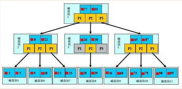如上圖,是一顆b+樹,關(guān)于b+樹的定義可以參見B+樹,這里只說一些重點,淺藍色的塊我們稱之為一個磁盤塊,可以看到每個磁盤塊包含幾個數(shù)據(jù)項(深藍色所示)和指針(黃色所示),如磁盤塊1包含數(shù)據(jù)項17和35,包含指針P1、P2、P3,P1表示小于17的磁盤塊,P2表示在17和35之間的磁盤塊,P3表示大于35的磁盤塊。真實的數(shù)據(jù)存在于葉子節(jié)點即3、5、9、10、13、15、28、29、36、60、75、79、90、99。非葉子節(jié)點只不存儲真實的數(shù)據(jù),只存儲指引搜索方向的數(shù)據(jù)項,如17、35并不真實存在于數(shù)據(jù)表中。