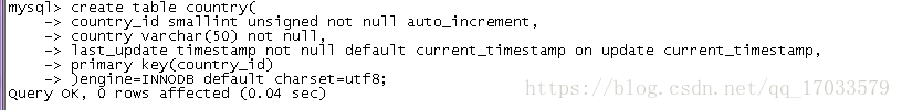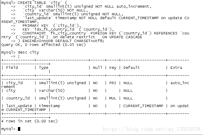 create table country( country_id smallint unsigned not null auto_increment, country varchar(50) not null, last_update timestamp not null default current_timestamp on update current_timestamp, primary key(country_id) )engine=INNODB default charset=utf8; CREATE TABLE `city` ( `city_id` smallint(5) unsigned NOT NULL auto_increment, `city` varchar(50) NOT NULL, `country_id` smallint(5) unsigned NOT NULL, `last_update` timestamp NOT NULL default CURRENT_TIMESTAMP on update CURRENT_TIMESTAMP, PRIMARY KEY (`city_id`), KEY `idx_fk_country_id` (`country_id`), CONSTRAINT `fk_city_country` FOREIGN KEY (`country_id`) REFERENCES `country` (`country_id`) on delete restrict ON UPDATE CASCADE ) ENGINE=InnoDB DEFAULT CHARSET=utf8;