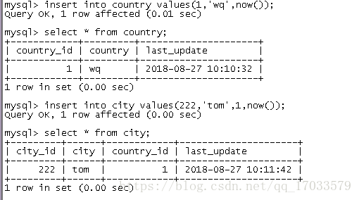 insert into country values(1,'wq',now()); select * from country; insert into city values(222,'tom',1,now()); select * from city;