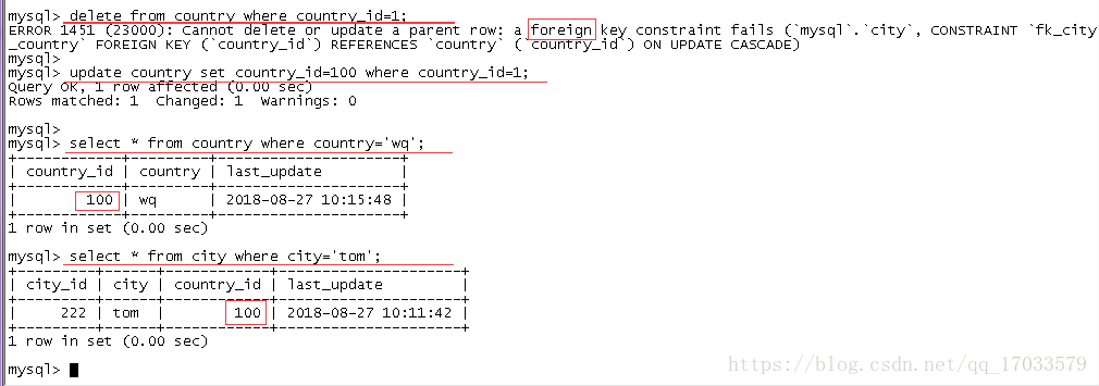 delete from country where country_id=1; update country set country_id=100 where country_id=1; select * from country where country='wq'; select * from city where city='tom';