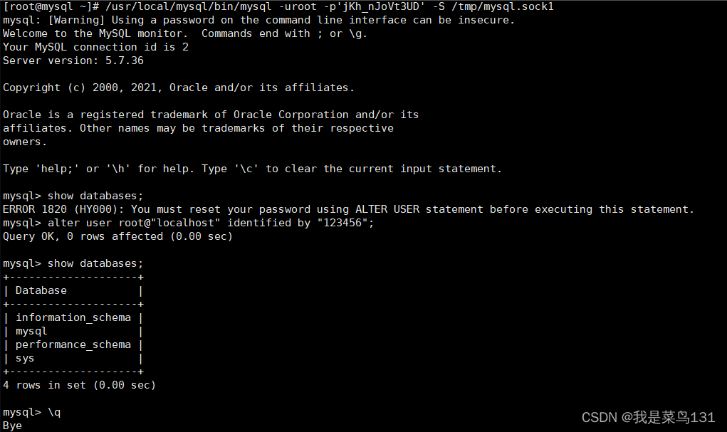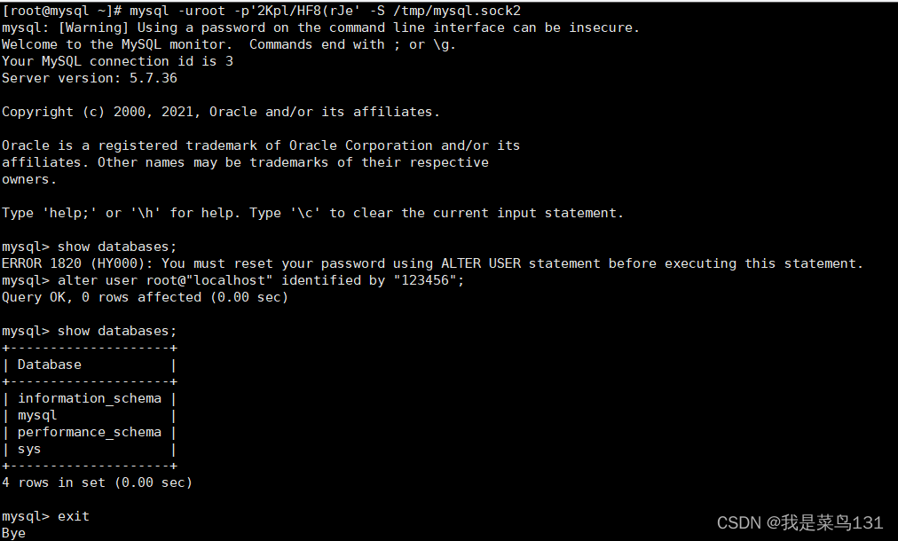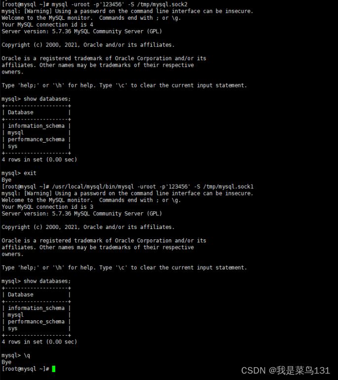 #mysql -uroot -p'初始密碼' -S sock文件 #mysql>alter user root@"localhost" identified by "新密碼"; #連接第一個數(shù)據(jù)庫實例測試 /usr/local/mysql/bin/mysql -uroot -p'' -S /tmp/mysql.sock1 show databases; alter user root@"localhost" identified by "123456"; show databases; exit #連接第二個數(shù)據(jù)庫實例測試 mysql -uroot -p'' -S /tmp/mysql.sock2 show databases; alter user root@"localhost" identified by "123456"; show databases; exit