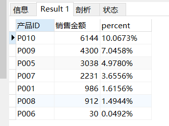 SELECT a.productID 產(chǎn)品ID,(a.sale_amount * b.price) 銷售金額,CONCAT((a.sale_amount * b.price / (select SUM(aa.sale_amount * bb.price) m from 2002a aa left join 2002b bb on aa.productID = bb.productID)) * 100,"%") percent FROM (select @rownum:=0) r,2002a a,2002b b WHERE (@rownum:=@rownum+1)<=(select round(count(distinct a.productid)*0.8) from 2002a a, 2002b b where a.productID = b.productID) AND a.productID = b.productID GROUP BY a.productID ORDER BY (a.sale_amount * b.price) DESC;