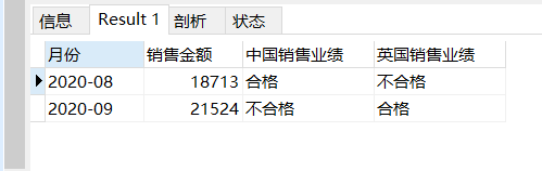 3)查詢中國(guó)、英國(guó)每個(gè)月份的銷售情況,2020年8月份銷售合計(jì)金額大于10000視為業(yè)績(jī)合格,否則為不合格,2020年9月份銷售合計(jì)金額大于12000視為業(yè)績(jī)合格,否則為不合格,結(jié)果輸出月份中國(guó)銷售業(yè)績(jī)、英國(guó)銷售業(yè)績(jī)。
