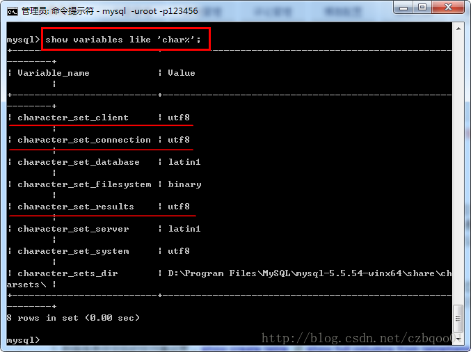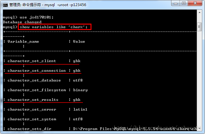 當(dāng)前聯(lián)接系統(tǒng)參數(shù)??show variables like 'char%';
