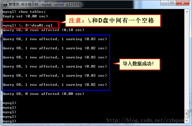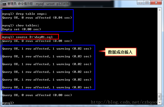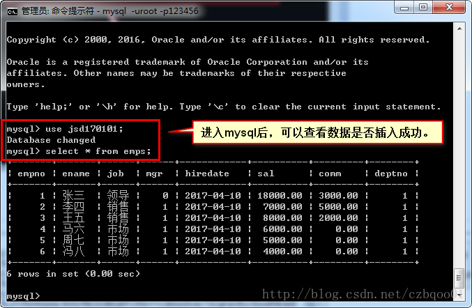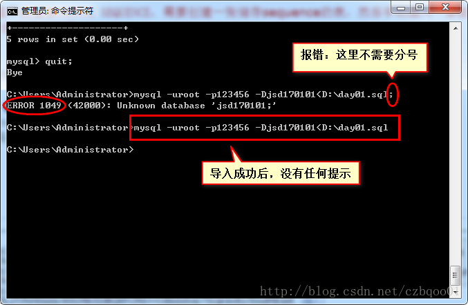 C:\Users\Administrator>mysql -uroot -p123456 -Djsd170101<D:\day01.sql