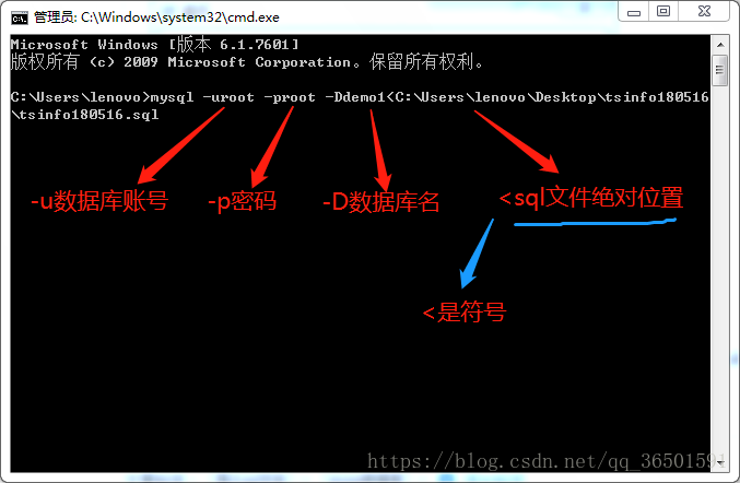 C:\Users\lenovo>mysql -u賬號(hào) -p密碼 -D數(shù)據(jù)庫(kù)名 < sql文件絕對(duì)路徑
