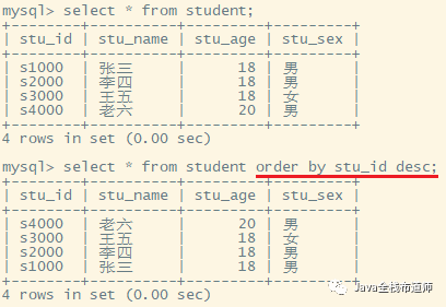--最簡(jiǎn)單的排序查詢: select * from tablename order by field; --完整語(yǔ)法: select [field1,field2,...,fieldn] fun_name from tablename [where condition] [group by field1,field2,...,fieldn [with rollup]] [having condition] [order by field1 [desc|asc], field2 [desc|asc],...,fieldn [desc|asc]]; DESC 代表降序(從大到?。?;ASC 代表升序(從小到大),asc為默認(rèn)排序。也就是說(shuō)你只要記住desc 就可以了。碰巧的是desc 是查詢表設(shè)計(jì)的關(guān)鍵字,而且語(yǔ)法很簡(jiǎn)單:desc tablename;