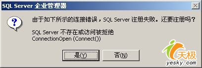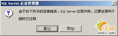 如果遇到第三個(gè)錯(cuò)誤,一般而言表示客戶端已經(jīng)找到了這臺(tái)服務(wù)器,并且可以進(jìn)行連接,不過是由于連接的時(shí)間大于允許的時(shí)間而導(dǎo)致出錯(cuò)。這種情況比較少見,一般發(fā)生在當(dāng)用戶在Internet上運(yùn)行企業(yè)管理器來注冊(cè)另外一臺(tái)同樣在Internet上的服務(wù)器,并且是慢速連接時(shí),有可能會(huì)導(dǎo)致以上的超時(shí)錯(cuò)誤。有些情況下,由于局域網(wǎng)的網(wǎng)絡(luò)問題,也會(huì)導(dǎo)致這樣的錯(cuò)誤。