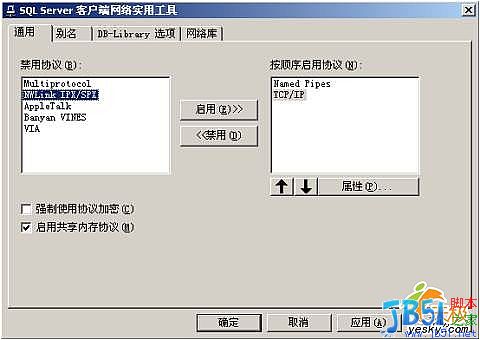 接下來我們要到客戶端檢查客戶端的網(wǎng)絡(luò)配置。我們同樣可以利用 SQL Server 自帶的客戶端網(wǎng)絡(luò)使用工具來進(jìn)行檢查,所不同的是這次是在客戶端來運(yùn)行這個(gè)工具。單擊:程序-> Microsoft SQL Server 客戶端網(wǎng)絡(luò)使用工具打開該工具后,在"常規(guī)"項(xiàng)中,可以看到客戶端啟用了哪些協(xié)議。同樣,我們需要啟用命名管道以及 TCP/IP 協(xié)議。點(diǎn)擊 TCP/IP 協(xié)議,選擇"屬性",可以檢查客戶端默認(rèn)連接端口的設(shè)置,該端口必須與服務(wù)器一致。
