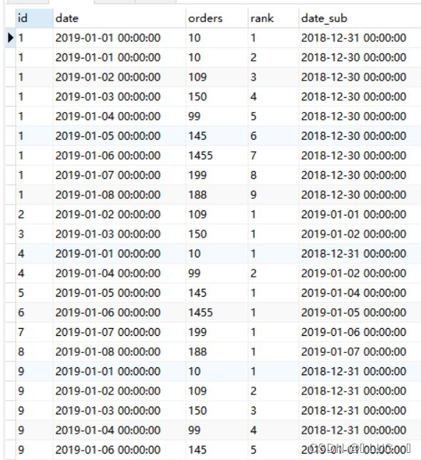 select *,DATE_SUB(a.date,interval a.rank day) 'date_sub' from( select *,row_number() over(partition by id order by date ) 'rank' from orde where orders is not NULL ) a;
