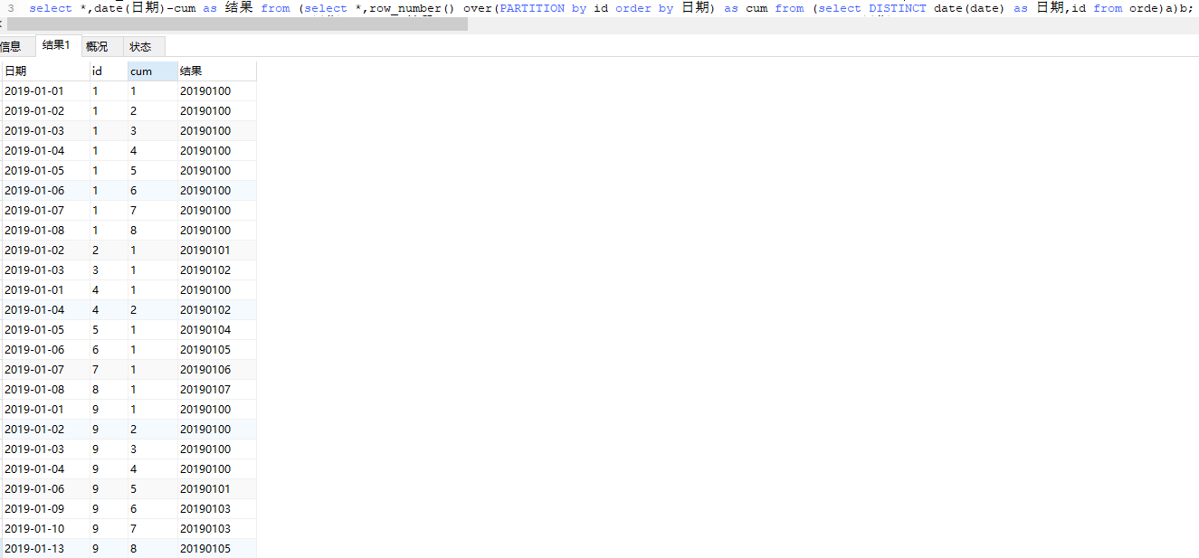 select *,date(日期)-cum as 結(jié)果 from (select *,row_number() over(PARTITION by id order by 日期) as cum from (select DISTINCT date(date) as 日期,id from orde)a)b;