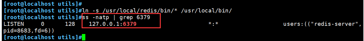 ln -s /usr/local/redis/bin/* /usr/local/bin/ #當(dāng)install_server.sh 腳本運行完畢,Redis 服務(wù)就已經(jīng)啟動,默認(rèn)偵聽端口為6379 ss -natp | grep 6379
