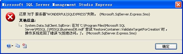 System.Data.SqlClient.SqlError: 在對 'C:\Program Files\Microsoft SQL Server\MSSQL.1\MSSQL\BusinessDB.mdf' 嘗試 'RestoreContainer::ValidateTargetForCreation' 時,操作系統(tǒng)返回了錯誤 '5(拒絕訪問。)'。 (Microsoft.SqlServer.Express.Smo)