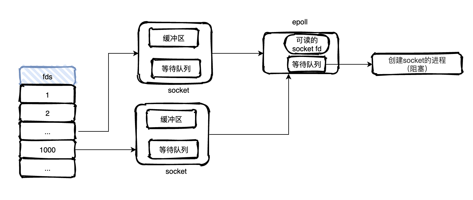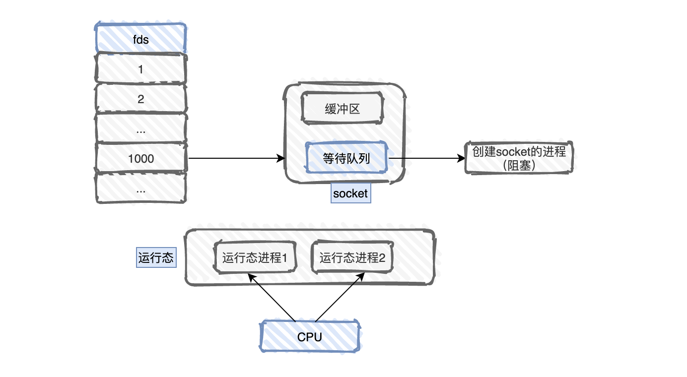 操作系統(tǒng)會為每個socket建立一個fd句柄,這個fd就指向我們創(chuàng)建的socket對象,這個對象包含緩沖區(qū)、進(jìn)程的等待隊(duì)列...。對于一個創(chuàng)建socket的進(jìn)程來說,如果數(shù)據(jù)沒到達(dá),那么他會卡在recv處,這個進(jìn)程會掛在socket對象的等待隊(duì)列中,對cpu來說,這個進(jìn)程就是阻塞的,它其實(shí)不占有cpu,它在等待數(shù)據(jù)的到來。