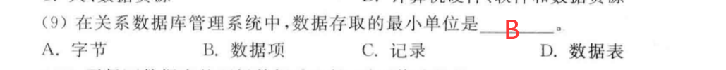 數(shù)據(jù)庫(kù)中數(shù)據(jù)的最小存取單位是數(shù)據(jù)項(xiàng)。
