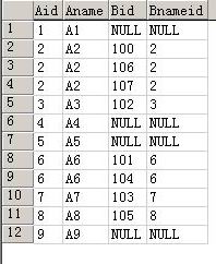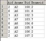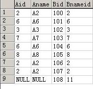 有SQL基本知識(shí)的人都知道,兩個(gè)表要做連接,就必須有個(gè)連接字段,從上表中的數(shù)據(jù)可以看出,在A表中的Aid和B表中的Bnameid就是兩個(gè)連接字段。