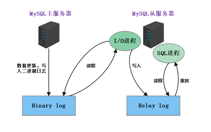 1、主從復制的原理:主服務器進行增刪改查數據更新,提交事務后,會寫入到二進制文件。從服務器的I/O線程請求探測主服務器的二進制文件,有新的數據時,主服務器會用dump線程將二進制文件發(fā)送給從服務I/O線程內存中,并寫入到中繼日志,SQL線程會偵聽中繼日志文件,有新的數據會讀取中繼日志文件,并將數據重放到從服務器數據庫中。