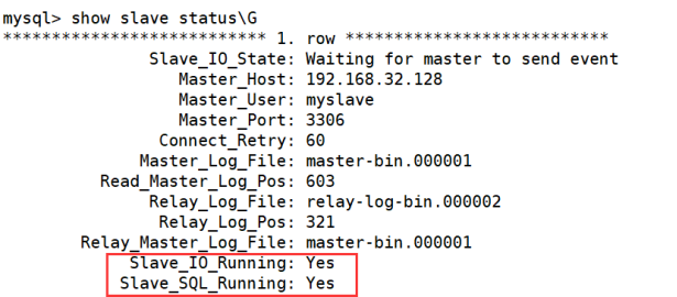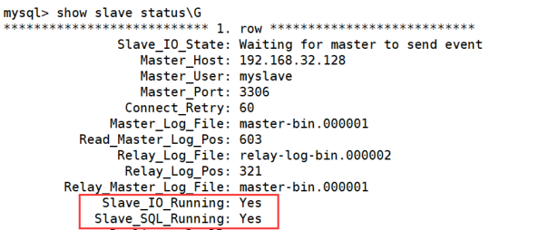 [root@localhost ~]# vim /etc/my.cnf server-id = 2 #修改,注意id與Master的不同,兩個Slave的id也要不同 relay-log=relay-log-bin #添加,開啟中繼日志,從主服務器上同步日志文件記錄到本地 relay-log-index=slave-relay-bin.index #添加,定義中繼日志文件的位置和名稱 mysql> change master to master_host='192.168.32.128',master_user='myslave',master_password='123456',master_log_file='master-bin.000001',master_log_pos=603; #配置同步,注意 master_log_file 和 master_log_pos 的值要與Master的一致 mysql> start slave; #啟動同步,如有報錯執(zhí)行 reset slave; mysql> show slave status\G #查看 Slave 狀態(tài)(確保 IO 和 SQL 線程都是 Yes,代表同步正常) Slave_IO_Running: Yes #負責與主機的io通信 Slave_SQL_Running: Yes #負責自己的slave mysql進程