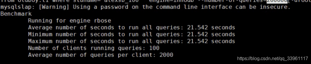 mysqlslap --defaults-file=/etc/my.cnf \ --concurrency=100 --iterations=1 --create-schema='testdb' \ --query="select * from testdb.t1 where stuname='test_100'" engine=innodb \ --number-of-queries=2000 -uroot -p123 -verbose