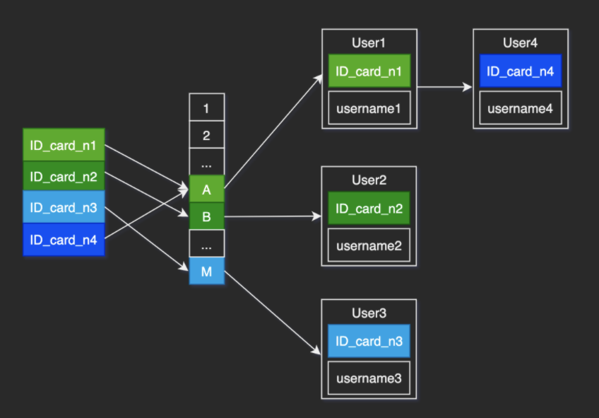 - 例如一個(gè)維護(hù)了身份證號(hào)和姓名的表,根據(jù)身份證號(hào)查找對(duì)應(yīng)名字,其hash索引如下: