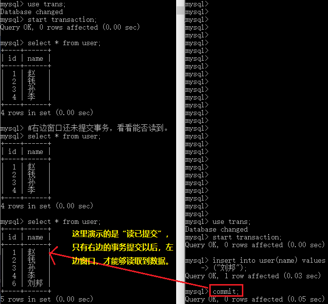 只有左邊這個(gè)黑窗口,先結(jié)束了當(dāng)前黑窗口的事務(wù),重新再次讀取,就可以看
