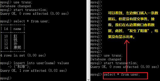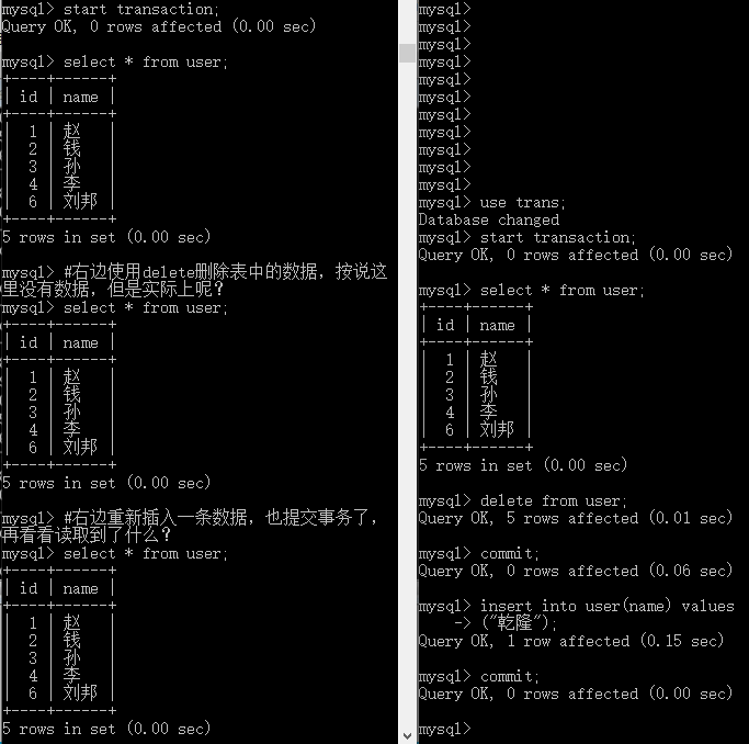 你別忘記了,左邊窗口,也是開啟事務(wù)功能了的,start transaction;只要