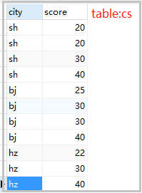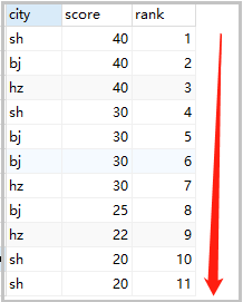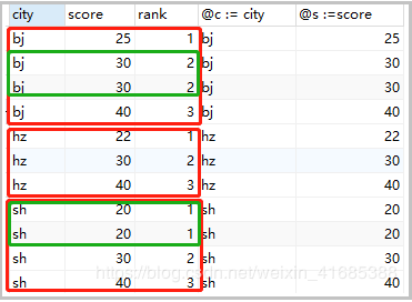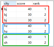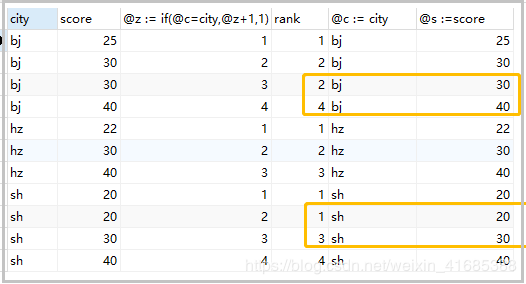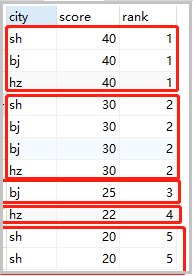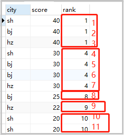 set @rank=0,@price=null; select cs.* , case when @price = score then @rank when @price := score then @rank := @rank+1 end rank from cs order by score desc; -- 當(dāng)查詢的score 值 = @price時,輸出@rank, -- 當(dāng)不等時,將score值賦給@price ,并輸出@rank := @rank+1 -- 或者 set @rank=0,@price=null; select a.city,a.score,a.rank from (select cs.*, @rank := if(@p=score,@rank,@rank+1) rank, @p := score from cs order by score desc) a;