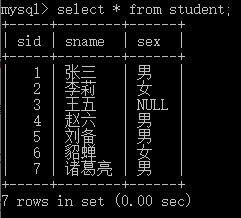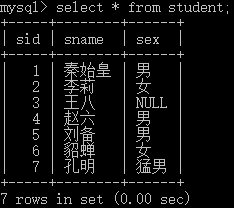insert into student(sname,sex) values ("趙六","男");