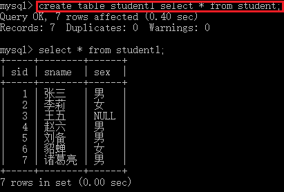 "創(chuàng)建一個student1表,表的結(jié)構(gòu)和數(shù)據(jù)均來自于student表。" mysql> create table student1 select * from student;