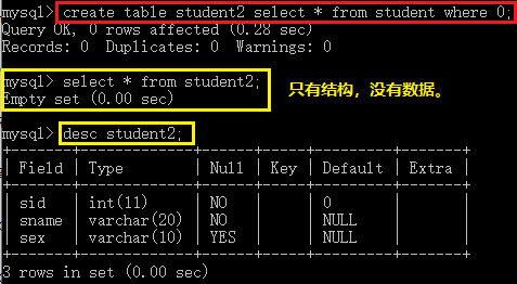 "創(chuàng)建一個student2表,只復(fù)制student表的結(jié)構(gòu),不要里面的數(shù)據(jù)。" mysql> create table student2 select * from student where 0;