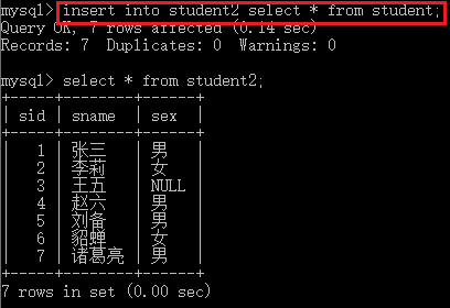 "在2基礎(chǔ)上,向student2表中插入數(shù)據(jù),數(shù)據(jù)來自于student表" mysql> insert into student2 select * from student;