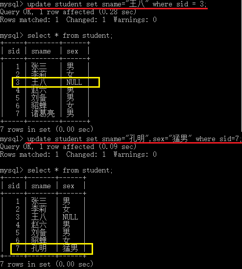 "語法格式:多個列之間用逗號隔開" update 表名 set 列1=值1 [列2=值2,列3=值3…… ] where條件; "演示示例如下" -- 把sid為3的王五的姓名,改為王八。 update student set sname="王八" where sid = 3; -- 把sid為7的諸葛亮的名字改為孔明,性別改為猛男。 update student set sname="孔明",sex="猛男" where sid=7;