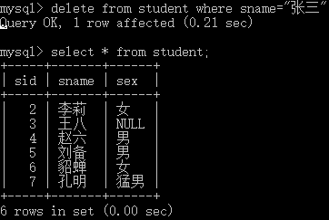 "語法格式:" delete from 表名 where 條件; "演示示例如下" delete from student where sname="張三";