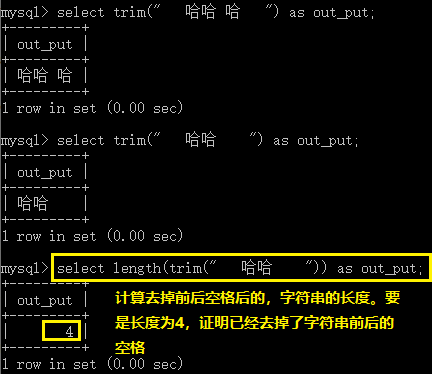 7)trim(str):去掉字符串前后的空格; 該函數(shù)只能去掉字符串前后的空格,不能去掉字符串中間的空格。