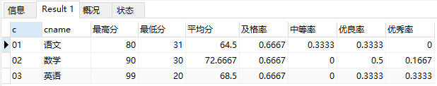 -- 課程ID,課程name,最高分,最低分,平均分,及格率,中等率,優(yōu)良率,優(yōu)秀率