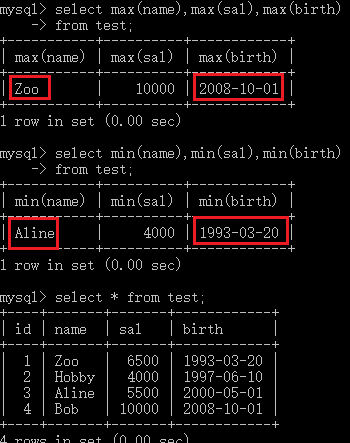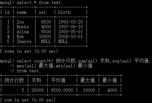 對sal列字段、birth列字段的行數(shù),進(jìn)行統(tǒng)計。由于其中有一條記錄是null值,因此使用count()