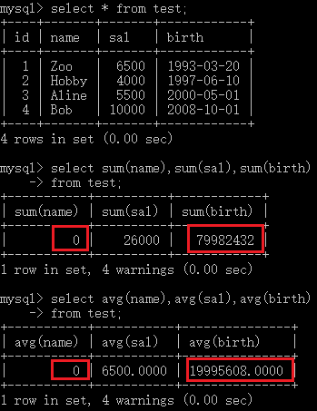 ② sum()函數(shù)和avg()函數(shù):傳入整型/小數(shù)類型才有意義;