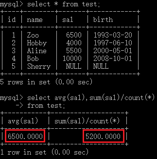 對于后面這個sum()/count(*)求平均值來說,(6500+4000+5500+10000)/5=5200。